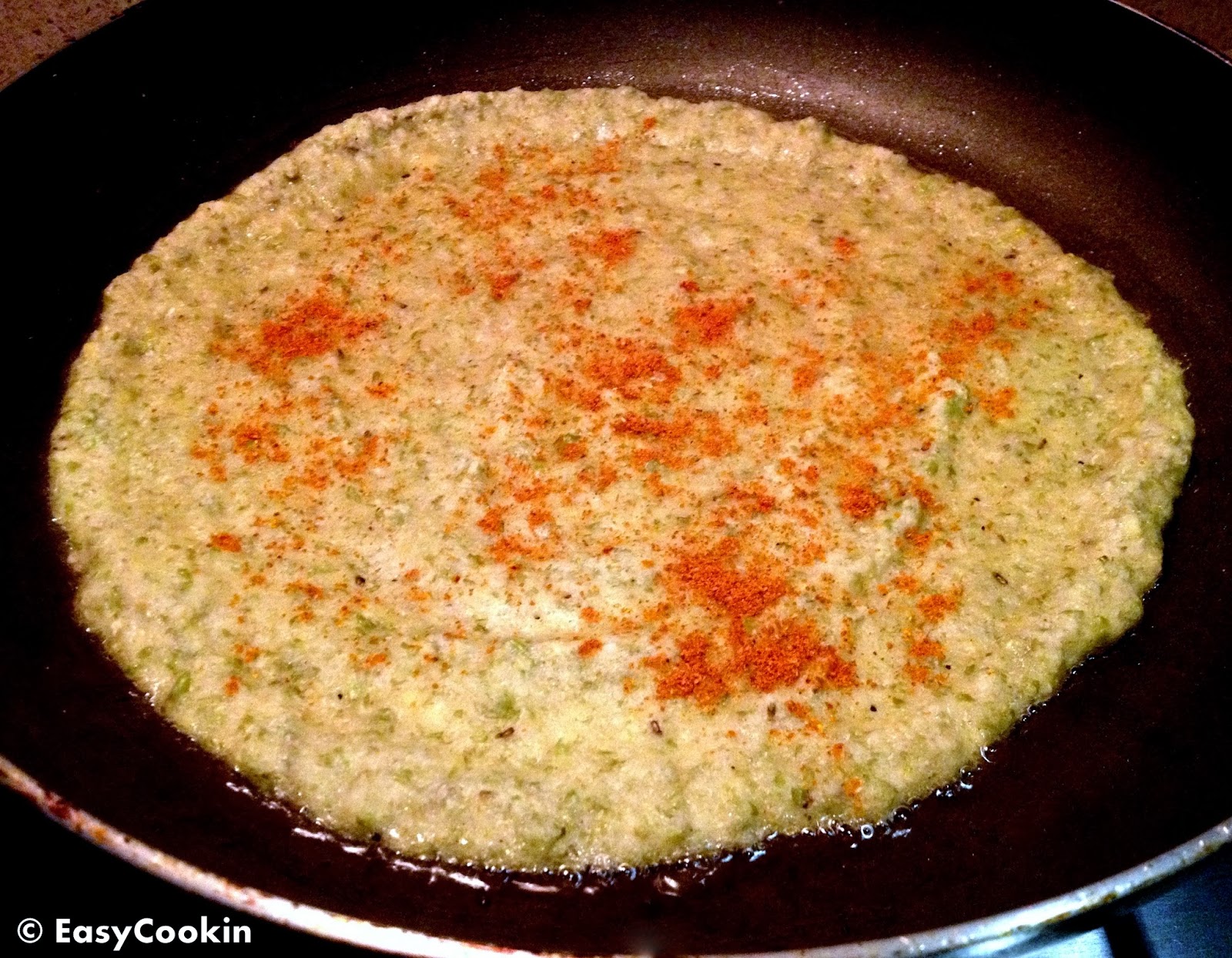 - Pour 1 heaping ladle of paste over the pan, swirl it using a ladle to form a round shape and sprinkle some sambhar powder – Pic2 (Sambhar powder is optional)